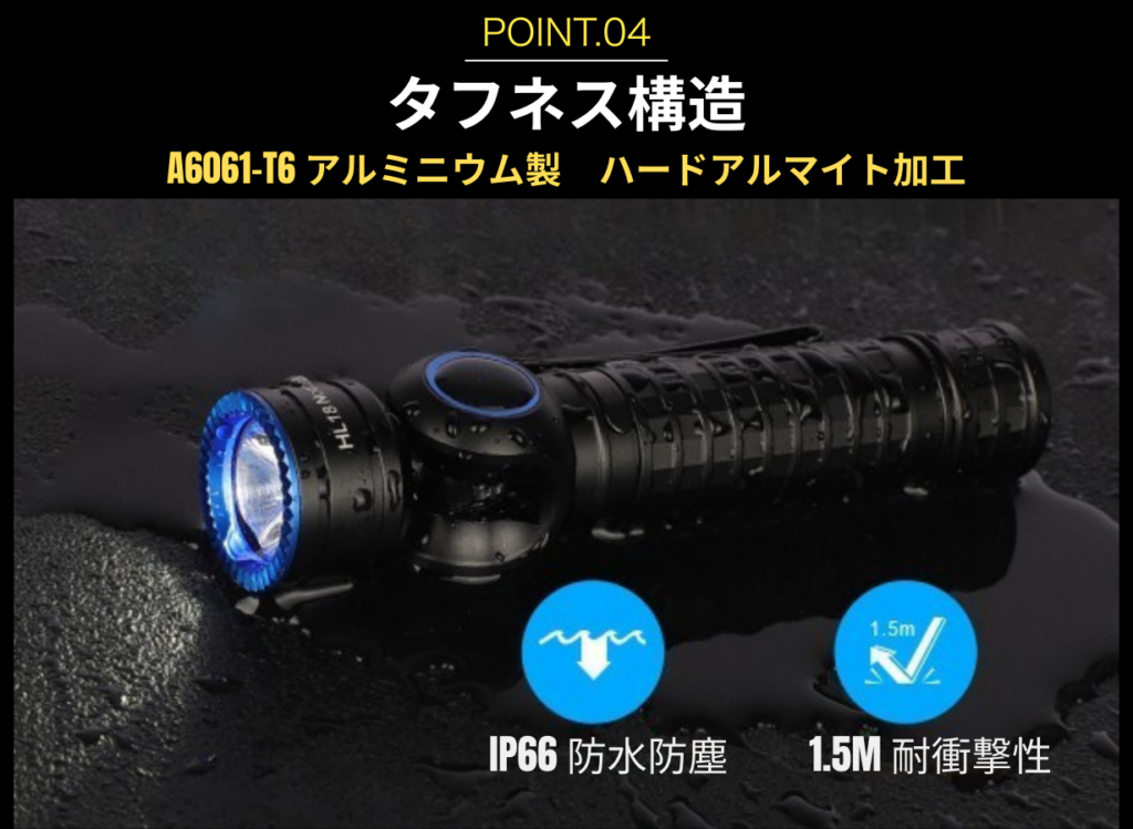 軍用規格のアルミ合金ボディにハードアルマイト加工を施し、1.5mの落下耐性を確保。土砂降りの雨や過酷なフィールドでも、決してあなたを裏切りません。