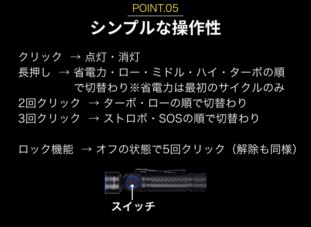 クリック一つで点灯・消灯、長押しでモード切替。前回の明るさを記憶する「メモリー機能」や、誤作動を防ぐ「5クリックロック」など、誰でも迷わず使える設計です。